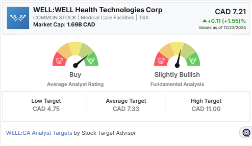 Stock Target Advisor rates WELL Health Technologies as “Slightly Bullish,” supported by eight positive signals, such as superior revenue and earnings growth, low debt, and high market capitalization.