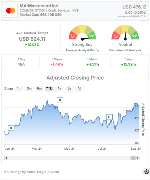 Mastercard’s stock price has seen significant volatility and impressive gains over the past year. As of its most recent closing, Mastercard’s share price was at $476.12, reflecting a 20.54% increase over the past month, despite a 7.22% dip in the past week. Over the past year, the stock has posted a 14.77% increase, signaling sustained long-term growth despite short-term fluctuations.