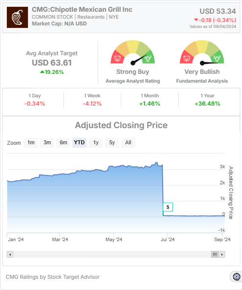 According to Stock Target Advisor, Chipotle’s stock is rated as “Very Bullish,” supported by two positive signals and no negative signals. The current stock price of Chipotle at the last closing was $53.34, with an average analyst target price of $63.61 over the next 12 months, suggesting a potential upside of over 20%.
